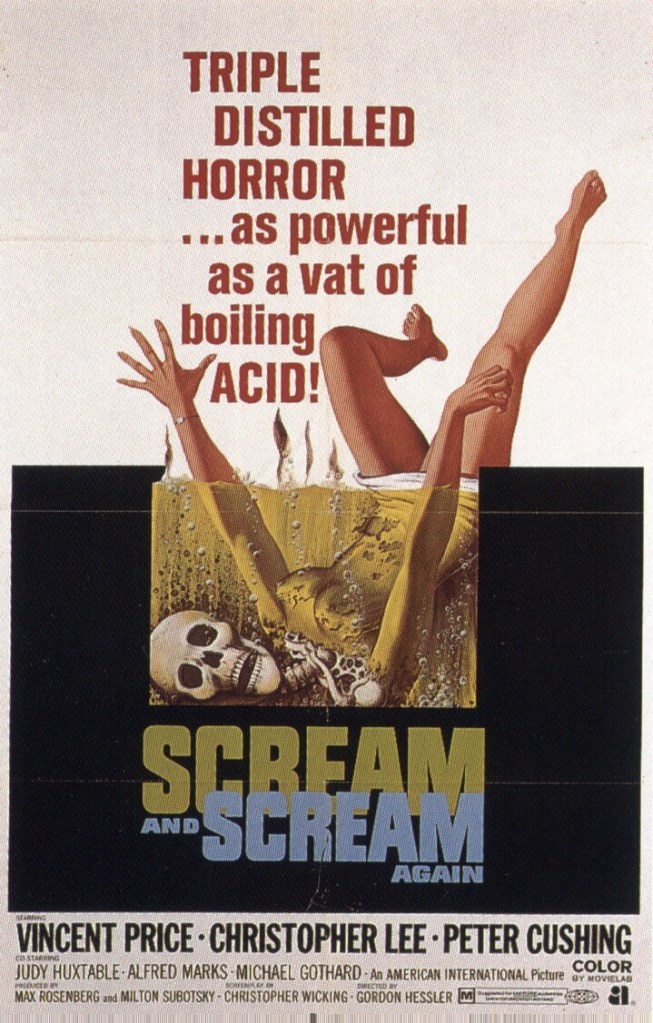 Scream is a distinctly odd sci-fi/horror film starring Vincent Price, Christopher Lee, and, briefly, Peter Cushing. At the time of release most critics deemed it incomprehensible. Roger Ebert called it “absurd” and “engagingly ridiculous.” (Roger Ebert, “Scream and Scream Again,” www.rogerebert.com, February 18, 1970.) The commentators for this newly issued DVD make a case for planned surrealism and also believe the police chase involving a kind of cyborg the longest in cinema history. Price’s scientist maintains that what he is creating will be great, “but not an evil super race.” Acid baths hide evidence of misdoing.