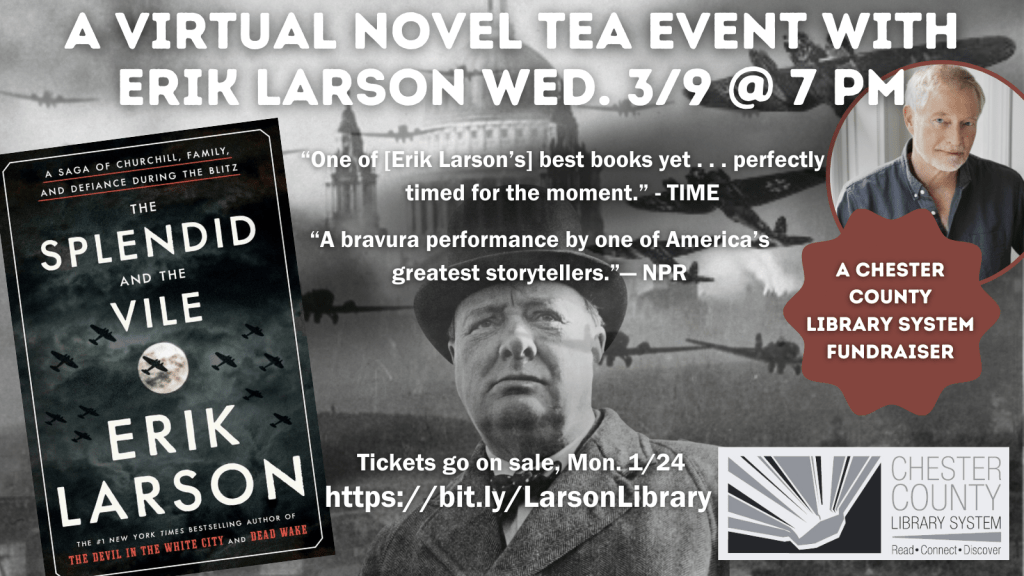 Visit https://bit.ly/LarsonLibrary for more event information, online registration, and ticket sales which opens on Monday, January 24 – March 8. Two ticket options consist of: a $55 Premium Tea Ticket which includes a library branded tea tin, chocolates, a signed novel, a book club discussion kit, and tea to enjoy at home while watching a live interview with Erik Larson. In purchasing a Basic Ticket for $35, you will receive a signed novel, a book club discussion kit, and a link to view the live stream.