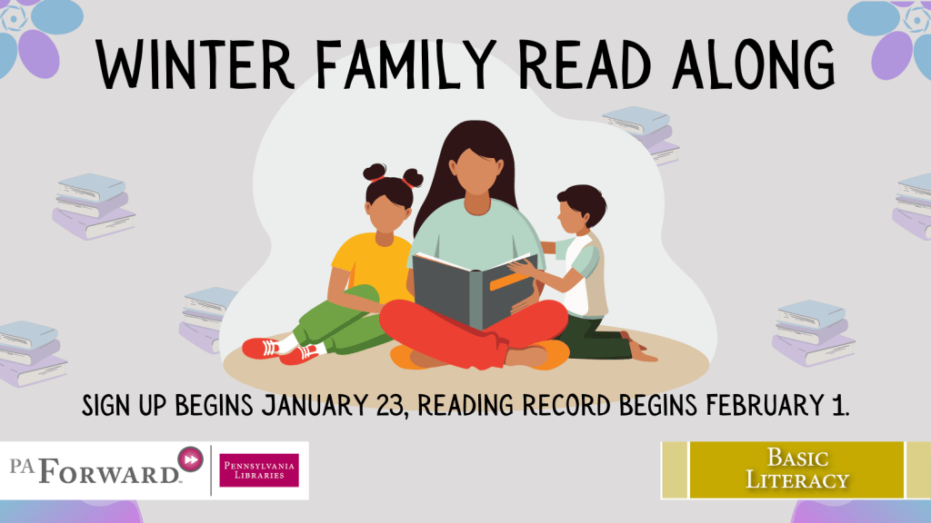 During the month of February, families at the Chester County Library and Henrietta Hankin Branch can once again participate in the Winter Read-Aloud Program. Read aloud to your child (birth through 6th grade) to earn a free book and raffle ticket for the Grand Prize. Stop by the Youth Services desk at either library starting January 23rd to pick up your reading log and get started!