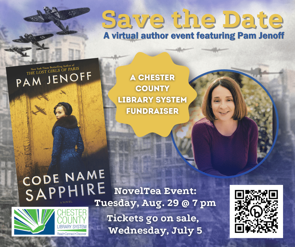Mark your calendars for Tuesday, August 29th at 7 pm. Join Chester County Library as we present a virtual Novel Tea event featuring New York Times Bestselling Author and local Philadelphia native, Pam Jenoff, who will be discussing her latest novel, Code Name Sapphire, released in February 2023.