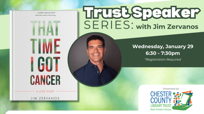 We are thrilled to announce that the Chester County Library Trust Speaker Series will kick off on Wednesday, January 29th, from 6:30 – 7:30 pm in the Struble Room at Chester County Library in Exton with Philadelphia-based author and teacher, Jim Zervanos.