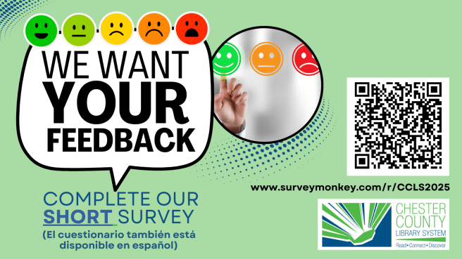 CCLS invites the public to participate in an online survey that will help shape the future of public libraries in Chester County. The survey will be open until February 21, 2025. Click here to take the survey.