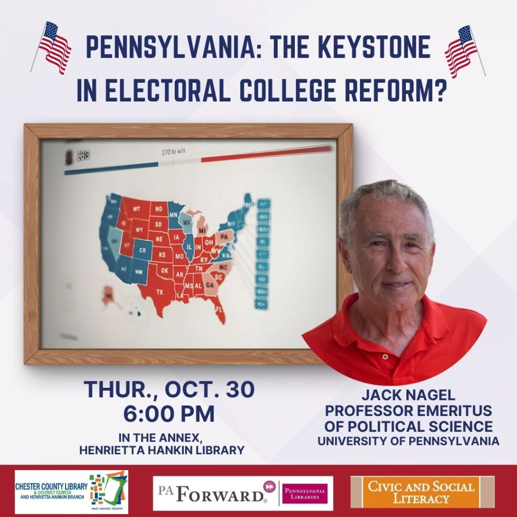 On Thursday, October 30th, from 6:00-7:30 p.m., Henrietta Hankin Branch Library welcomes Professor Jack Nagel, Political Science Emeritus at the University of Pennsylvania, for a discussion on the Electoral College. He’ll explore its historical challenges and talk more about the National Popular Vote Interstate Compact—a state-led effort to align electoral votes with the national popular vote. With 209 of 270 votes pledged, Pennsylvania could be key to its success.