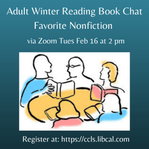 Please join us for an informal virtual book chat on Tuesday, February 16 at 2 pm. This month’s themed discussion will be Favorite Nonfiction. We’ll present our favorite nonfiction titles – bring yours too!