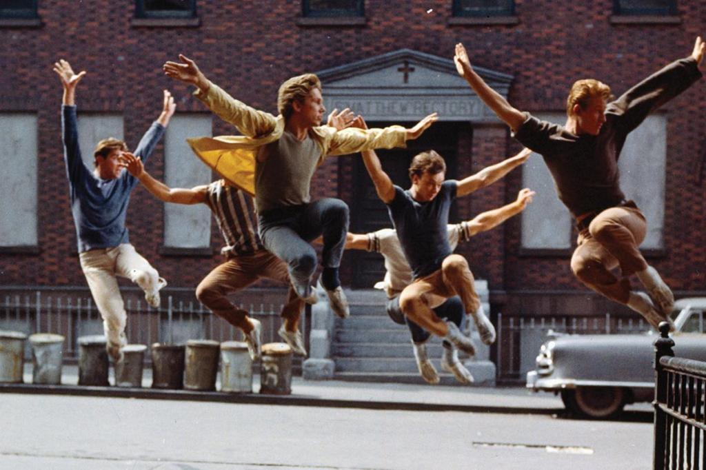 West Side Story (1961). This was a movie for people who didn’t or didn’t think they liked musicals, especially teenage boys. It began with a bang: aerial shots over New York City that dropped closer and closer to street level and the crummy tenements wherein rival delinquent gangs, the Sharks (Puerto Ricans) and Jets (white teens), vied for control of the mean streets. When they started dancing, it was not seen as sissified.