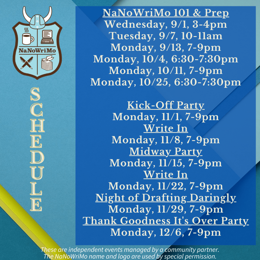 NaNoWriMo Schedule Kick-Off Party Monday, 11/1, 7-9pm Write In Monday, 11/8, 7-9pm Midway Party Monday, 11/15, 7-9pm Write In Monday, 11/22, 7-9pm Night of Drafting Daringly Monday, 11/29, 7-9pm Thank Goodness It’s Over Party Monday, 12/6, 7-9pm